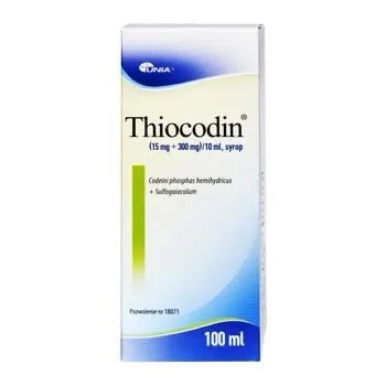 Thiocodin syrop (15 mg + 300 mg)/10 ml is an over-the-counter medicine that helps fight dry, persistent, unproductive cough. The medicinal product combines the properties of two medicinal substances. Buy Thiocodin syrop 100 ml
